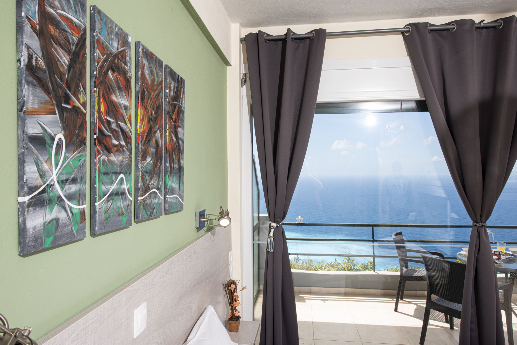 This studio is on the bottom building on the elevated ground floor with a private balcony, front sea and sunset view. Inside there is a double banker bed for the children and a proper double bed. Inside like all studios there is a small but fully equipped kitchen area, with a fridge and freezer, a multimedia tv an air condition and wifi.